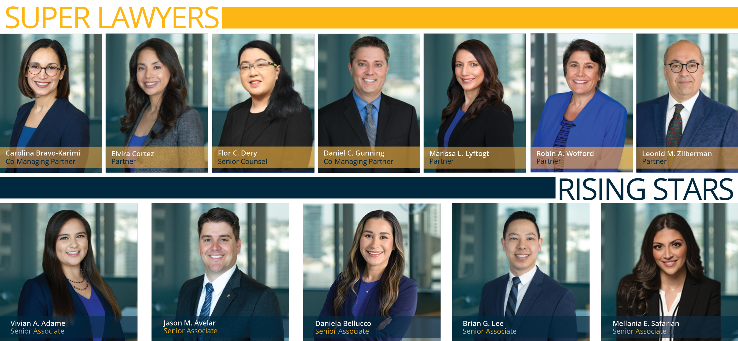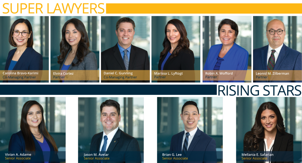 Co-managing partner Carolina Bravo-Karimi earned recognition among both the Top 25 Women San Diego Super Lawyers and the Top 50 San Diego Super Lawyers. Co-managing partner Daniel C. Gunning, along with partners Marissa L. Lyftogt, Robin A. Wofford, and Lonny M. Zilberman, were acknowledged for their work in employment litigation (defense) and employment and labor law. Partner Elvira Cortez was recognized for her work in business litigation.